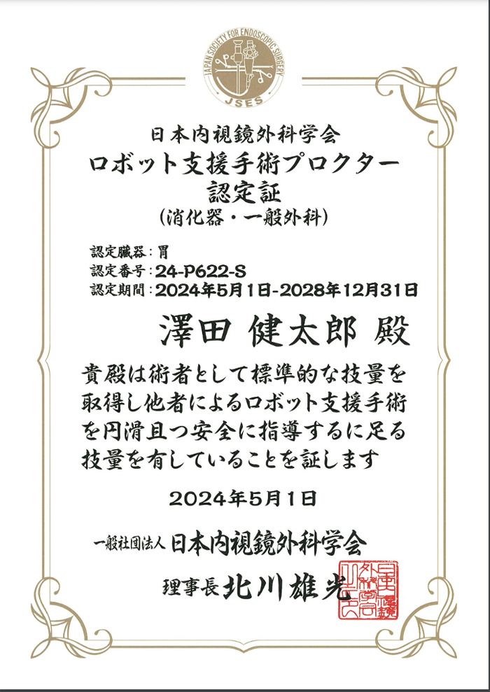 消化器外科、澤田健太郎助教が胃切除術において、ロボット支援手術プロクター(指導医)に認定されました。