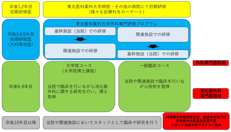 さらに、後期研修終了後には当院や関連施設で十分な臨床経験を積んでもらい消化器外科専門医を取得してもらいます。大学院博士課程においては臨床を行いながらの研究も可能と考えております。